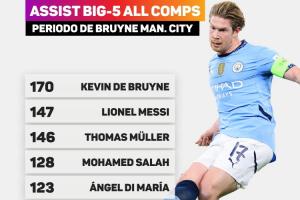 数据统计显示,自2015年8月德布劳内加盟曼城算起,整个欧洲五大联赛送出助攻最多的球员是德布劳内,他在为曼城效力的422场比赛中送出170次助攻。