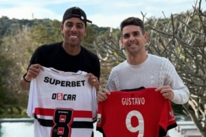 体育资讯7月7日讯 效力海港的巴西前锋古斯塔沃更新社媒,晒出他和前海港中场奥斯卡的合照,两人互换球衣。