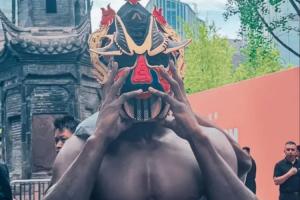 他戴着获赠的赵云戏剧面具在成都太古里逛街。