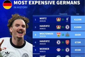 体育资讯9月1日讯 沃尔特马德已经官宣加盟纽卡斯尔,《转会市场》统计显示他也是第5位转会费超过5000万欧元的德国球员(哈弗茨两次上榜)。