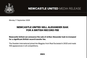 纽卡官网的声明:“纽卡斯尔联宣布将前锋亚历山大-伊萨克以创英国转会费纪录的价格出售给利物浦。这位瑞典国脚于2022年从皇家社会转会至喜鹊,并在各项赛事中出场109次。”