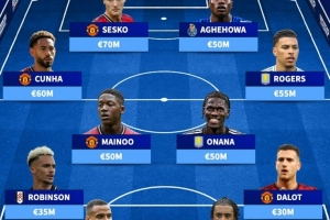 中场:库尼亚(曼联,6000万欧)、梅努(曼联,5000万欧)、奥纳纳(维拉,5000万欧)、罗杰斯(维拉,5500万欧)