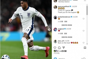 拉什福德重返英格兰队,并连续两场比赛首发出场,他在社交媒体上晒出自己的赛场照片,配文:“两战两胜,感谢你们的支持。”