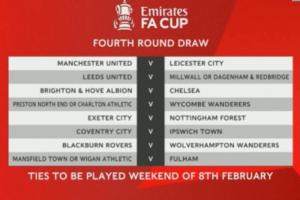 体育资讯1月13日讯 足总杯第四轮抽签结果出炉,将有四场英超内战,利物浦和曼城抽到好签。切尔西将客战布莱顿,维拉将对阵热刺,曼联主场迎战莱斯特城,埃弗顿主场对阵伯恩茅斯,