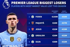 本赛季英超身价下滑榜:福登下滑5000万欧最多,前6曼城占4席